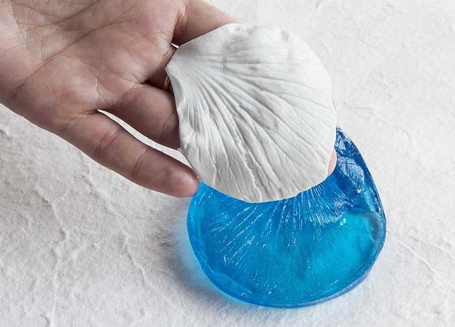 - Каждый элемент цветка тщательно обрабатывают, придавая нужную форму, фактуру и объем. Для этого используют техники нагрева, растягивания, перетирания и т. п. С помощью молдов и прочих специальных приспособлений формируют изгибы и близкие к естественным рисунки прожилок.