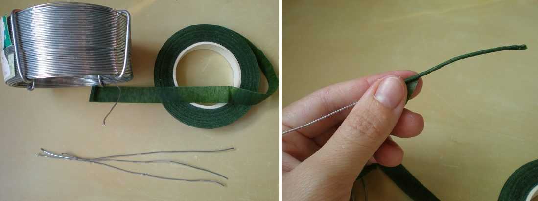 Отмеряем нужную длину флористической проволоки для каждого листа. Заматываем её тейп-лентой с утолщением на одном конце.