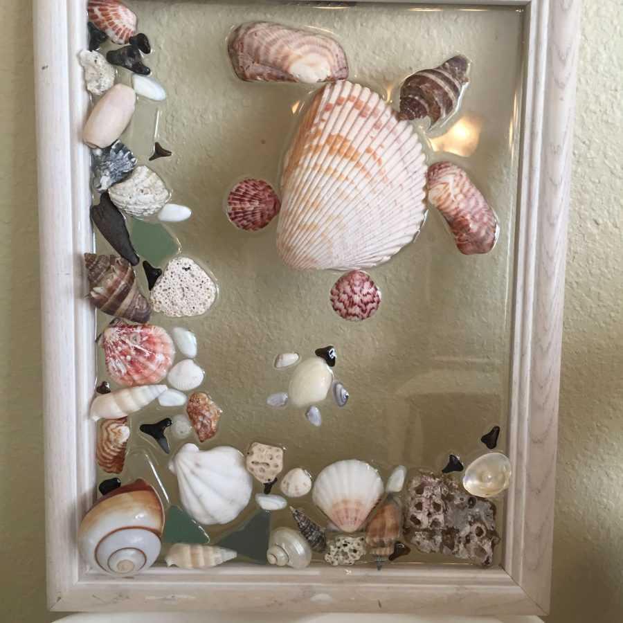 Ракушки были куплены в Турции, и все камушки привезены от туда же. Долго я собирала и стаскивала всё в кучку, пока не придумала какую картину хочу.