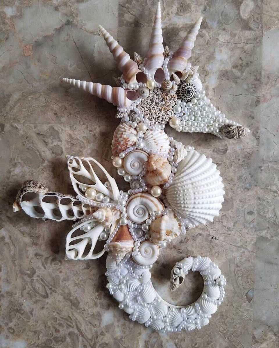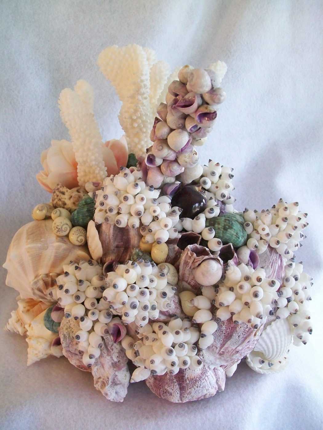 При создании этих объектов дизайнерского творчества используются не только раковины, но и морские звезды, другие морские обитатели, ветки причудливых форм и камни.