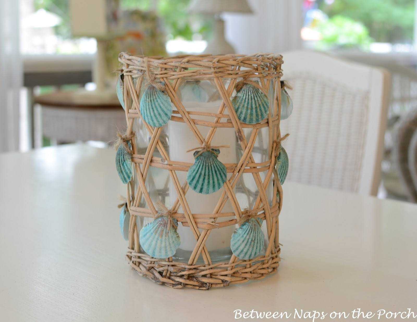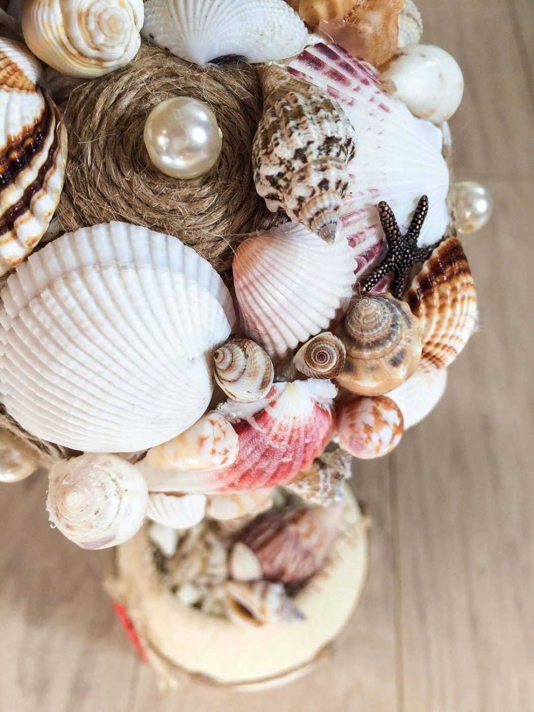 В одном из вариантов он изготовляется на круглой основе. На нее последовательно укладываются и скрепляются клеем небольшие морские раковины. В другом варианте используется иная идея. Раковины приклеиваются на стакан, а свеча помещается внутрь.