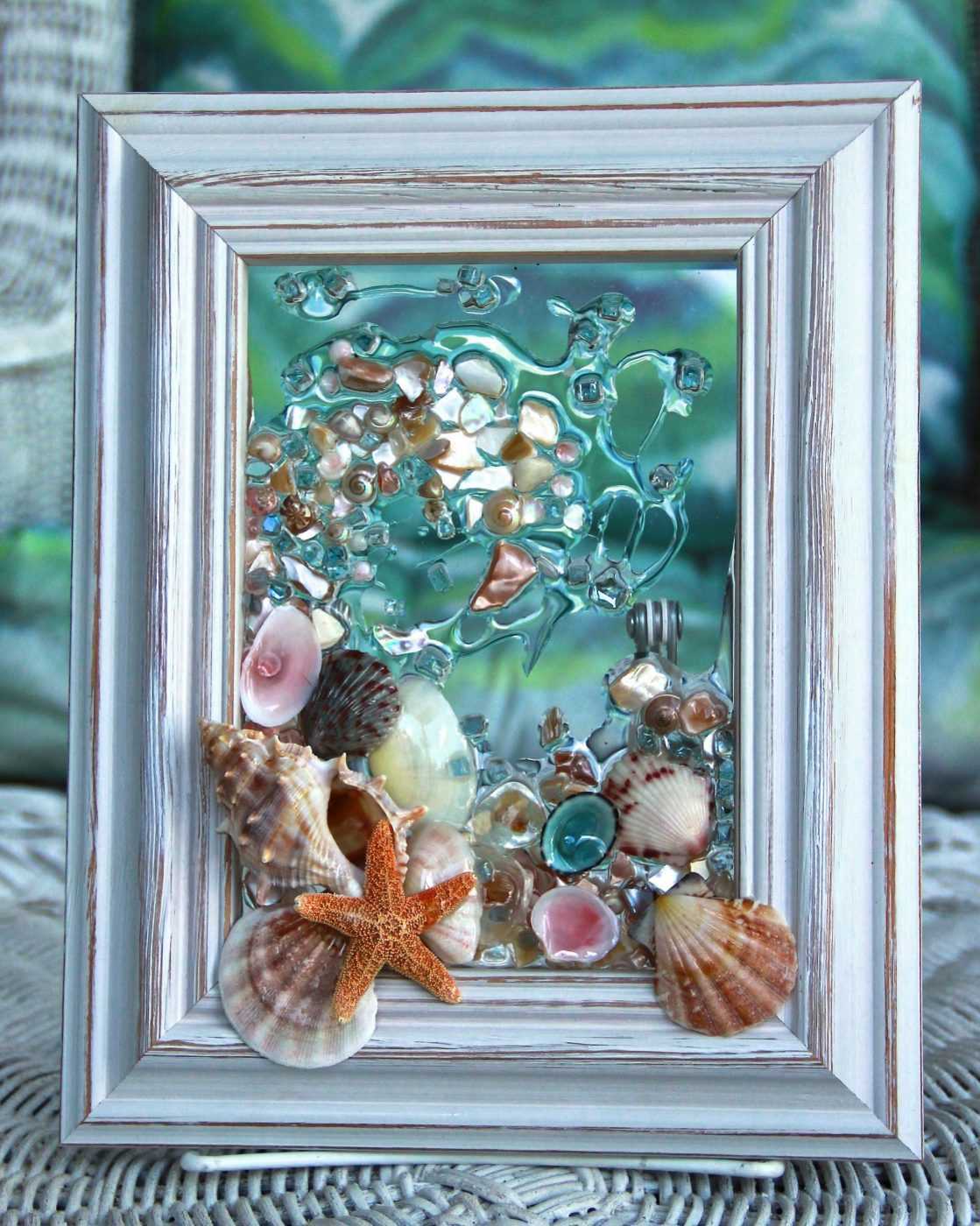 - Рамку тоже можно покрасить. К морской тематике особенно хорошо подойдет белый или синий цвет, но ориентироваться стоит на цветовую гамму композиции и интерьера.
