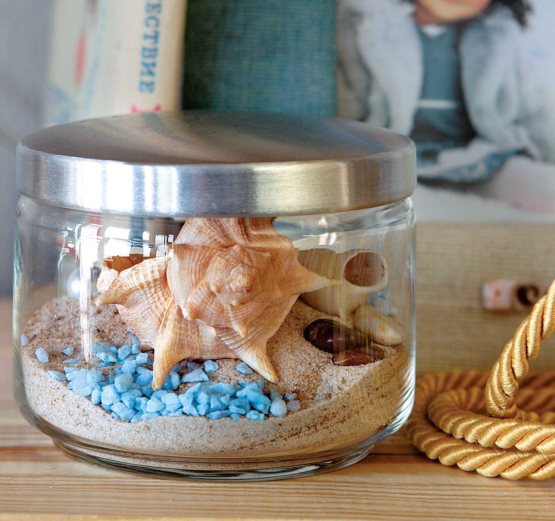 Обычные стеклянные баночки, украшенные снаружи раковинами, преображают интерьер кухни и делают его эстетически привлекательным.
