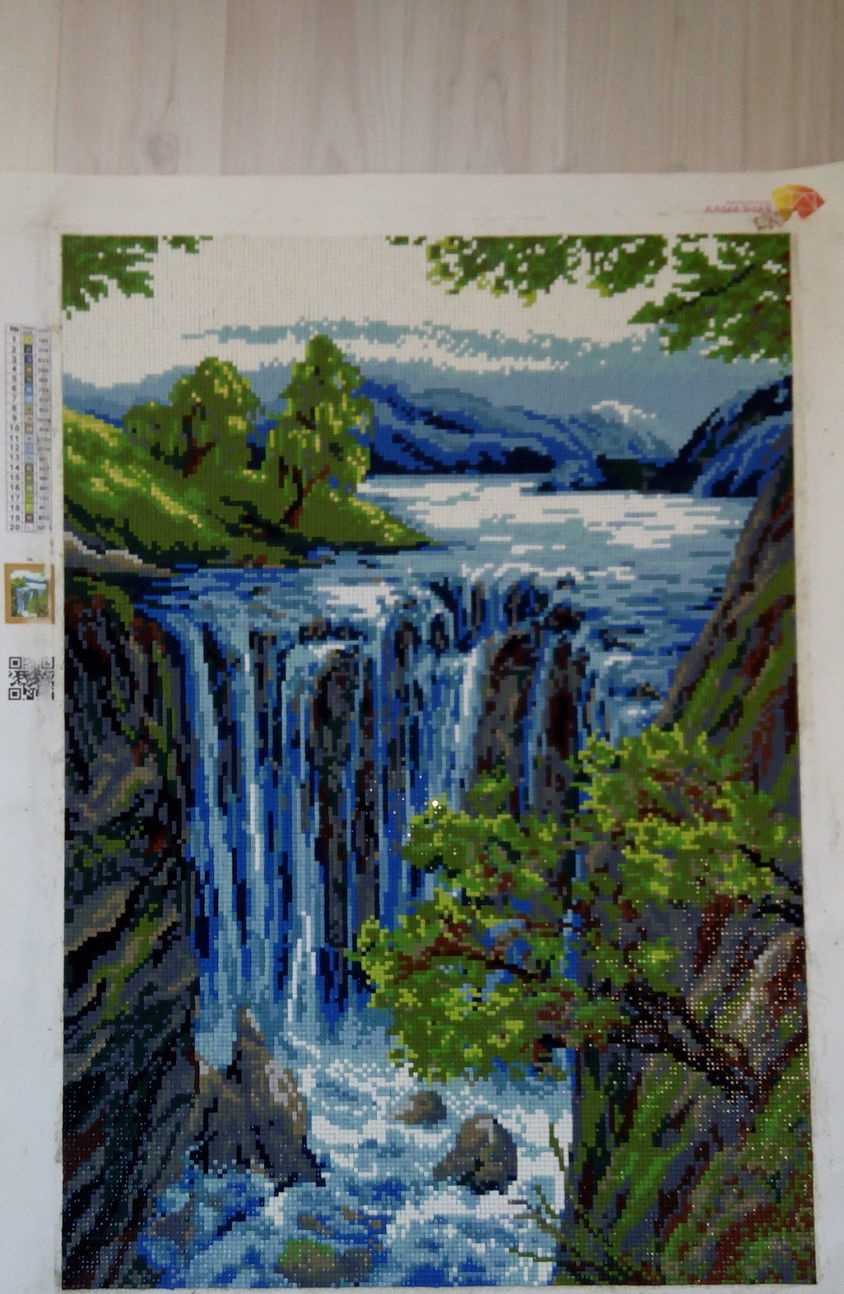 - Если картина большая и состоит из нескольких отдельных холстов, то края каждого из них (около 3- 4 ряда), лучше выкладывать уже после их соединения в один. Если вначале выложить холсты полностью, то соединить их потом будет очень проблематично;
