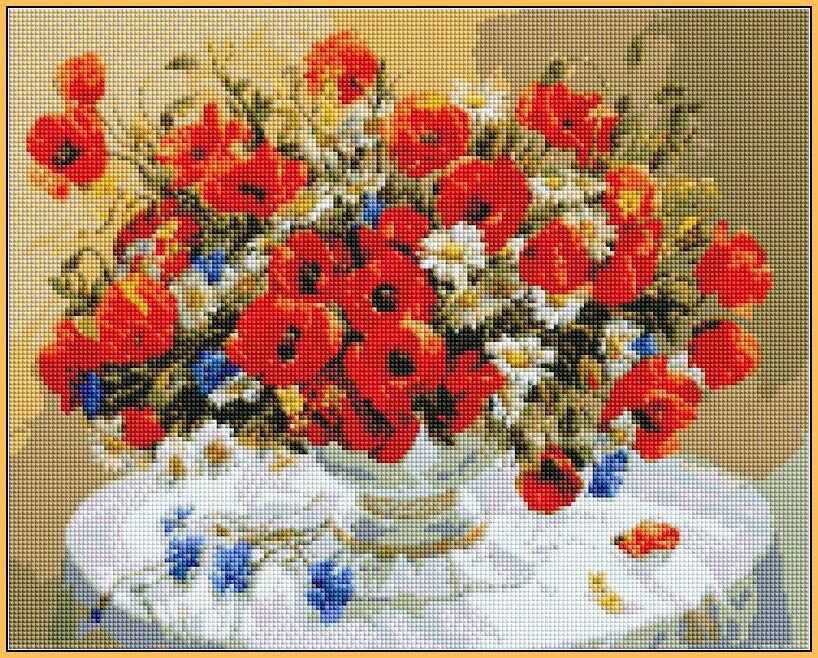Для создания рисунка используются схемы вышивки крестом. Готовая работа блестит и переливается, благодаря граням на кристаллах, а хозяйка гордится своим рукоделием.