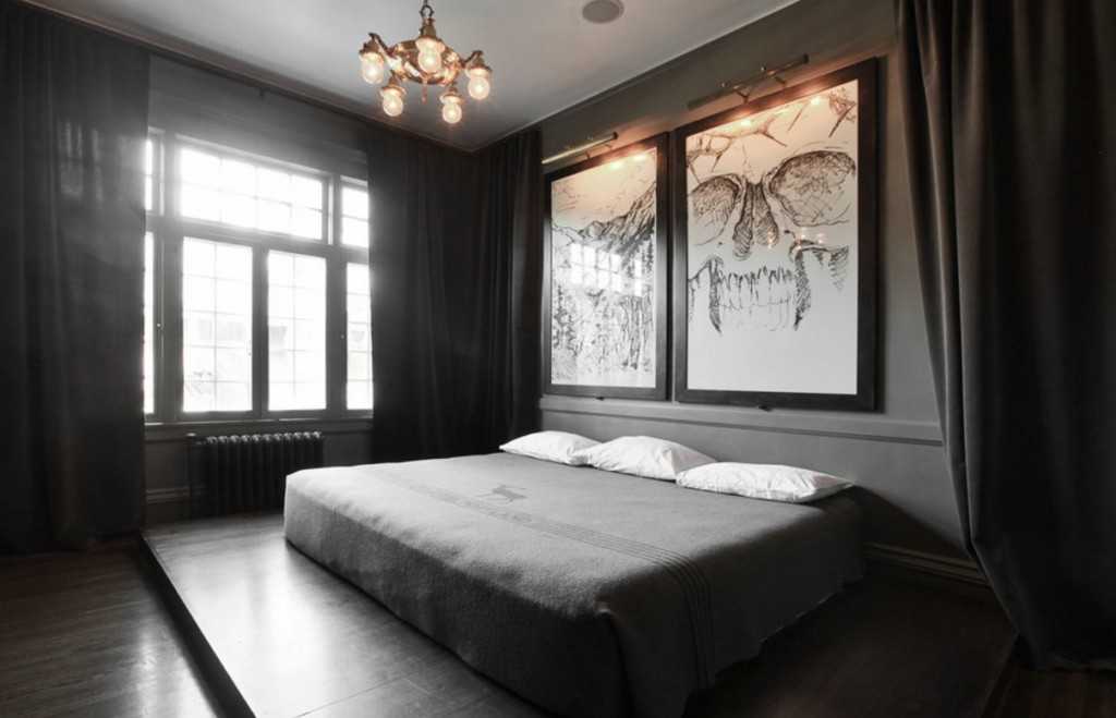 Старинные работы придают облику дома шарм, наделяет его атмосферой и историей. В оформлении опочивальни допустима продуманная небрежность, когда холсты стоят на полу, прислонённые к стене. Вернисаж выглядит, как будто собранный наспех, это добавляет лёгкость и творческую нотку. Кроме того, так можно быстро менять экспозицию, без новых дыр в стене.