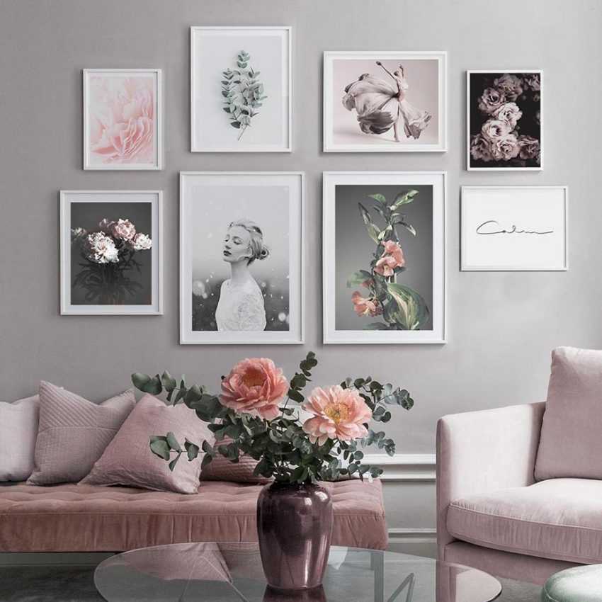 - модной тенденцией стало весить на одну стену много картин разных размеров. Их хаотично распределяют по всей стене, что создаёт иллюзию лёгкого беспорядка и подойдёт для современных стилей;