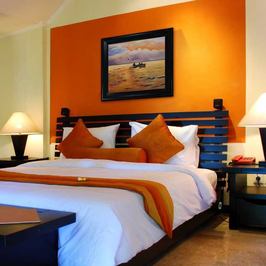 Яркий интерьер уже сам по себе привлекает достаточно внимания. Особенно, если он выдержан в таком насыщенном солнечно-оранжевом цвете. Чуть приглушить глубокий цвет и сделать интерьер более утонченным помогает изящная роспись белой краской над изголовьем кровати. Две асимметрично расположенные белые полочки с миниатюрной статуэткой дополняют декоративное оформление стены.