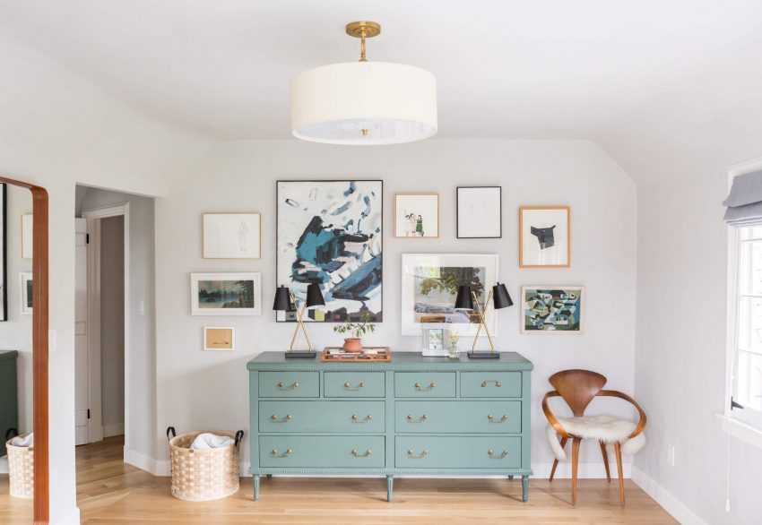 Принты разного размера выравнивают по нижнему краю, размещают на уровне глаз. Висящие низко, или слишком высоко рисунки искажают геометрию пространства.