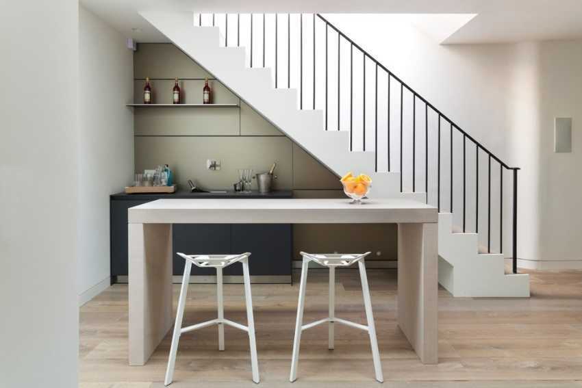 Белый, бежевый и разные оттенки коричневого повторяются в отделке, мебели и оформлении лестницы. В идеале получается гармоничное целостное помещение, которое остается дополнить хорошим освещением и небольшим количеством элементов декора.