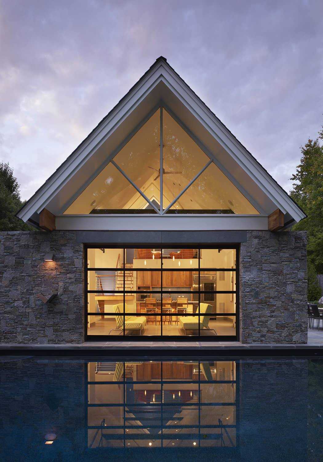 На фото ниже интересное решение формы кровли придает оригинальности дому с «французскими» окнами и дверью до пола.