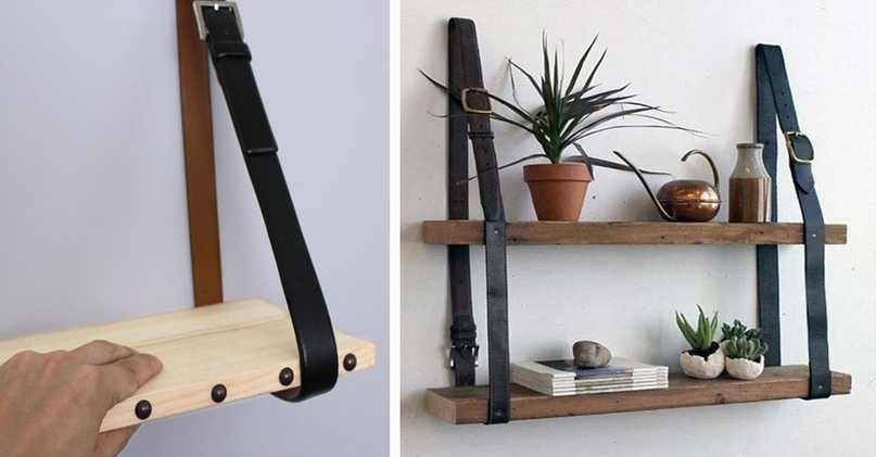 - Затем приготовьте ремни. Длина их зависит от ширины полки и от ее расстояния от креплений на стене. Примерные размеры: ширина доски — 15 см, растояние от отверстий на стене — 25 см, длина кожаных полосок — 70 см.