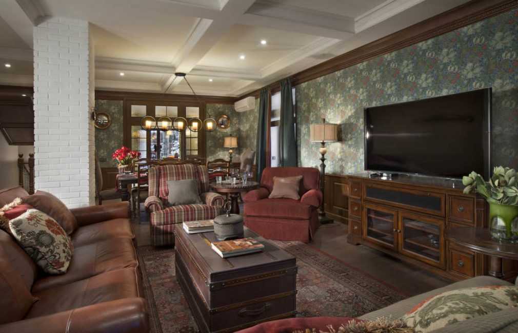 Акцент делается на деревянной мебели из дорогих пород, обязательным атрибутом этого стиля является наличие камина.