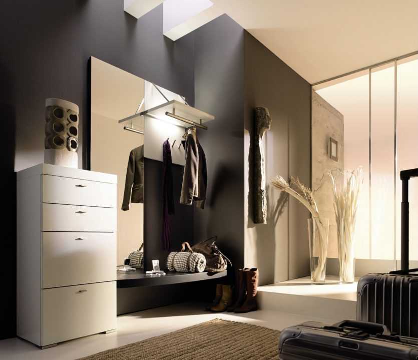 - Выбирайте функциональные предметы обстановки. Ваша задача обустроить место для верхней одежды, сохранив при этом свободное пространство. Откажитесь от громоздких шкафов, заменив их встроенными моделями небольшой глубины с выдвигающимися ящиками и полочками.