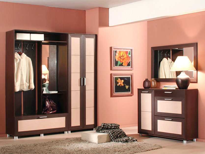 При выборе шкафа, избегайте ненужных украшений — глянец, камушки и прочих элементов. Вполне хватит обычного шкафа, сделанного из натурального дерева, и дубового или орехового оттенка. Если площадь прихожей позволяет, разумно будет разместить здесь большой комод. Еще к этому можно добавить зеркала в деревянных рамках, «старые» металлические вешалки, плетенные пуфы и т. д. Все это придаст прихожей атмосферу уюта и спокойствия. Не помешает скамья или деревянный ящик для размещения обуви.