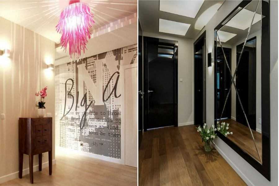 Особым приемом являются зеркала, хотя нередко ограниченность пространства не позволяет разместить в коридоре просторное зеркальное полотно. При недостатке места достаточно зеркала в раме, выдержанной в общей стилистике. Зеркало может быть вмонтированным в стеновые ниши и имеющим боковую подсветку.