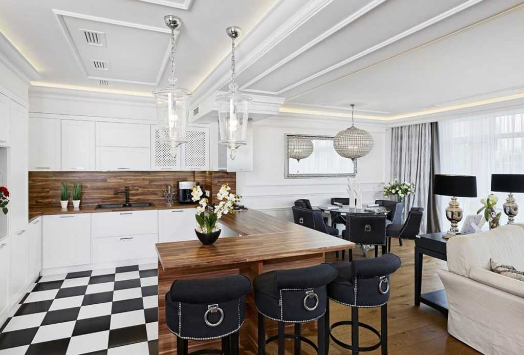 Если выбирается неоклассика, то стоит учесть, что смотрится она только в просторных помещениях с высокими потолками. Сам стиль предполагает много света, использование дорогих отделочных материалов натурального происхождения. В оформлении на первом месте прямые четкие формы, симметричные детали. В отделке присутствуют белые оттенки с вкраплением золотого в виде деталей декора. Часто можно встретить в таких помещениях большие многоярусные люстры, лепнину на потолке, арки и колонны. Присутствие зеркал и камина дополняет общую картину. Впрочем, современные варианты могут быть и не столь вычурными – главное, должны сохраняться строгие формы, белые оттенки, дорогая мебель и отделка.