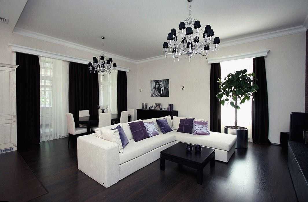 Шторы в белую гостиную можно выбирать любые, это зависит от стиля комнаты.