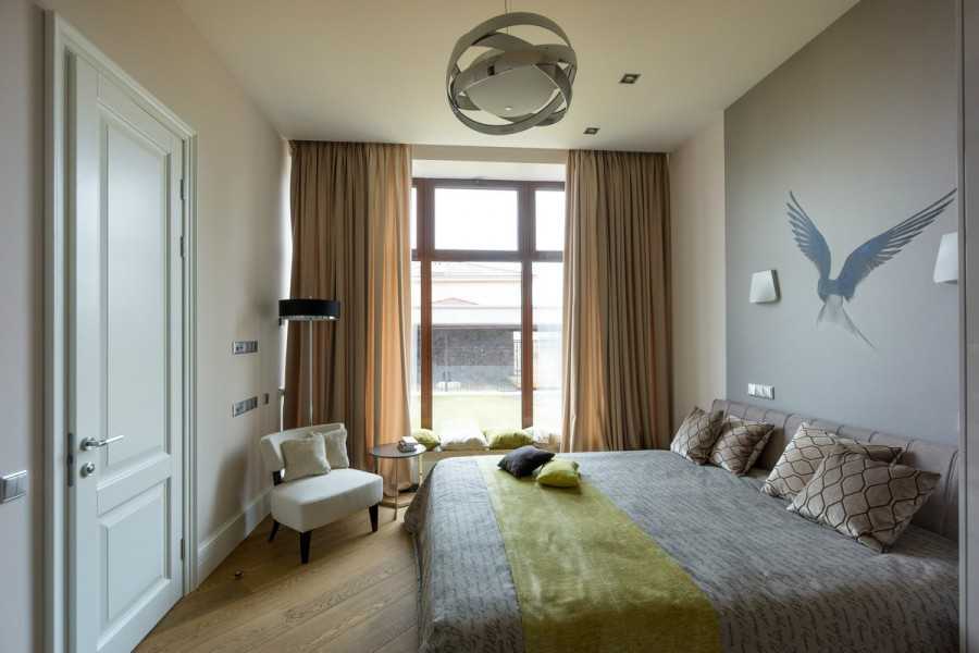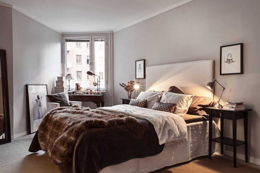 В спальной комнате лучше устанавливать полноценные кровати, чтобы обеспечить здоровый сон. Вдоль одной из стен можно установить шкаф-купе для хранения вещей. В качестве альтернативы можно организовать в нише гардеробную.