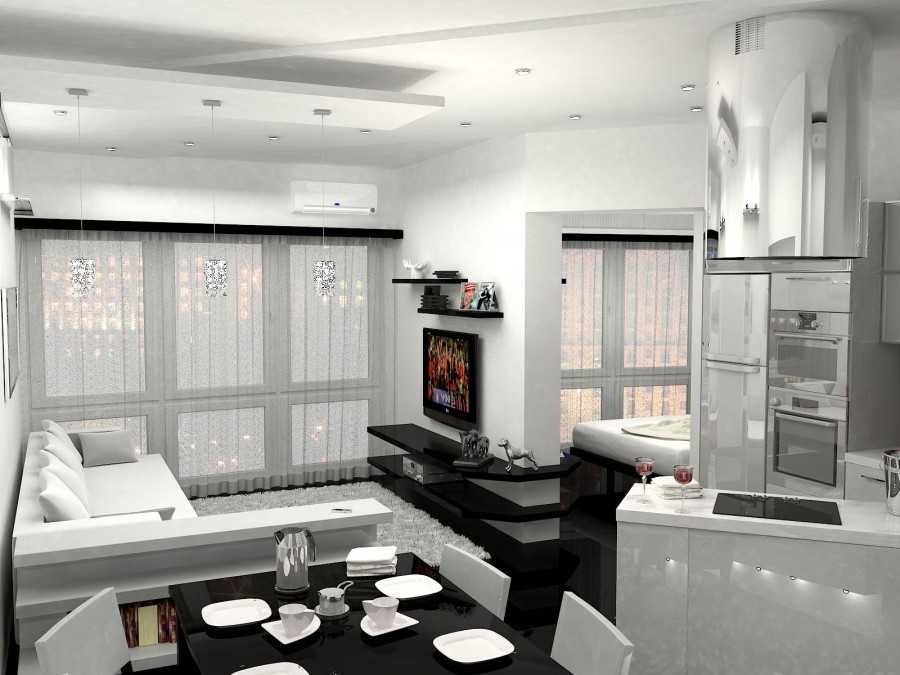 В этом случае убирают стены, которые не являются несущими и не относятся к санузлу. Такой вариант вполне уместен, когда в квартире живет один или два человека. На фото — примеры интерьеров, воплощенных на такой площади.