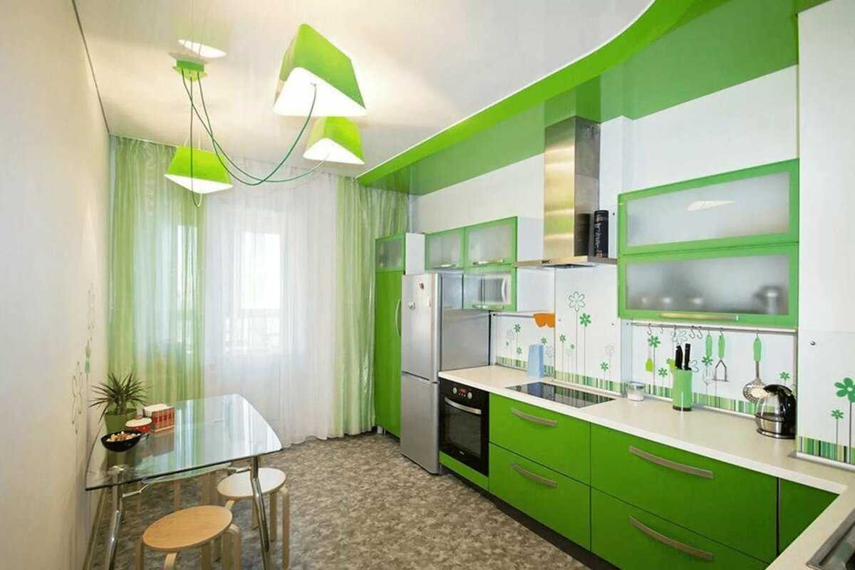 - Потолок. Потолочную плоскость на кухне дополнит натяжное полотно или гипсокартонная многоуровневая конструкция. Интересно будет смотреться двухцветный потолок или окраска с узорами салатового цвета. Самым простым решением является белая матовая поверхность, обрамленная с помощью белоснежного плинтуса.