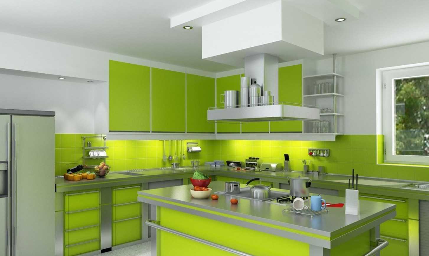 Изящества и грации дизайну кухни в салатовом цвете придадут насыщенные зеленоватые оттенки.