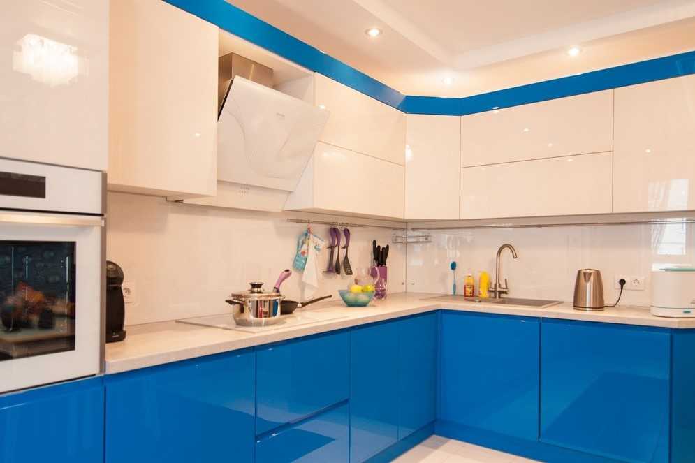 Если кухня маленькая, дизайнеры не рекомендуют злоупотреблять синими цветами. Он допустим в отдельных элементах – нижний фасад гарнитура, рабочий фартук, декор. При этом синюю гамму подбирают светлую, чтобы помещение казалось больше и шире.