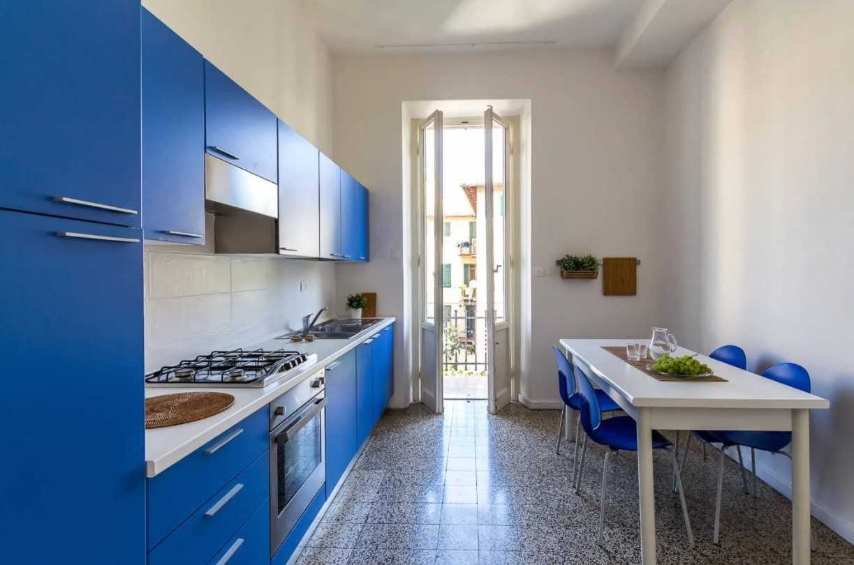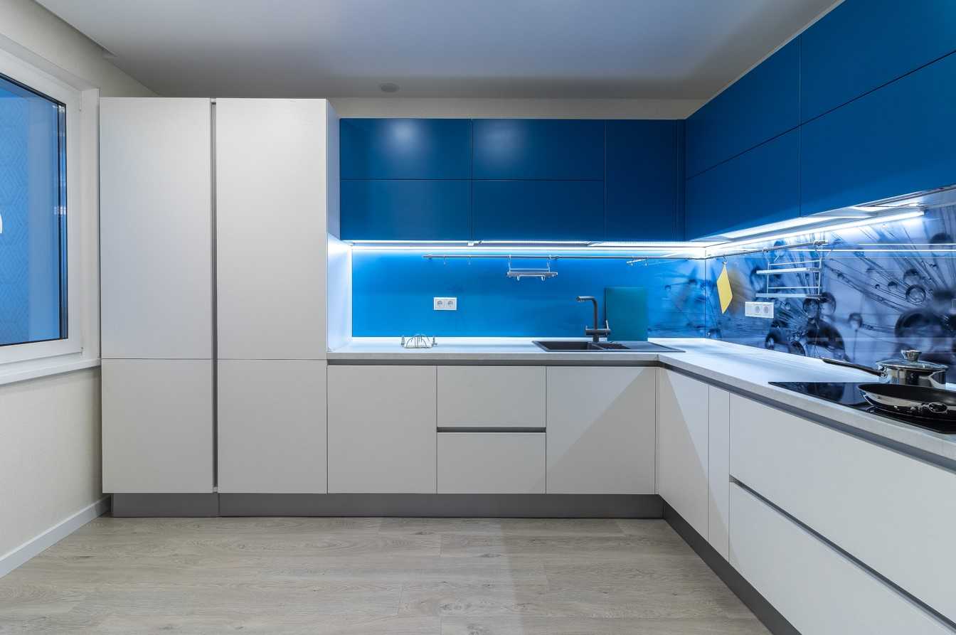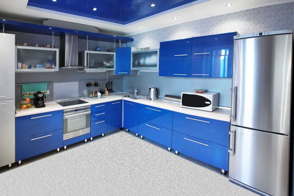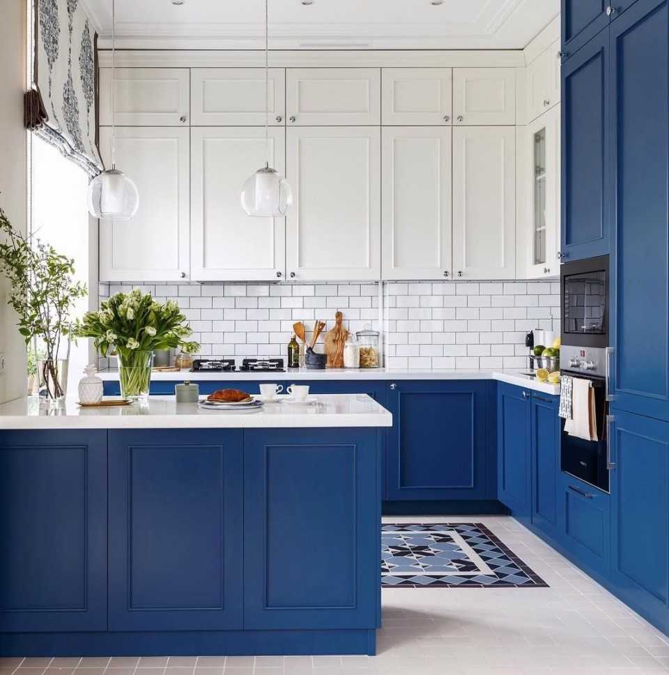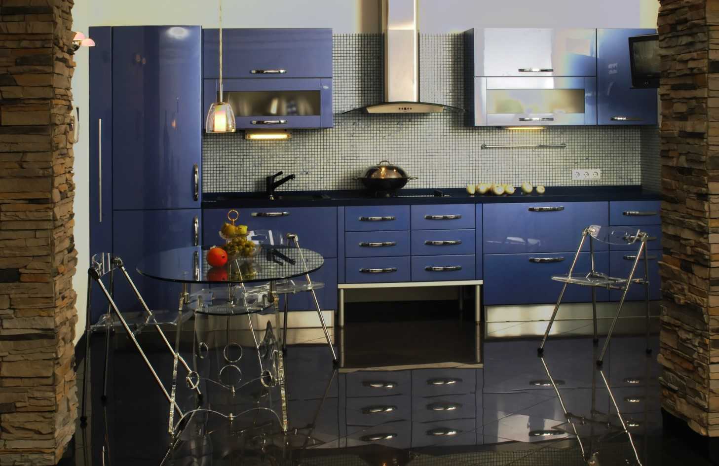 В просторной освещенной кухне синий вполне может стать основным цветом пола, стен и гарнитура. Оптимальной пропорцией разбавления синего цвета считается 1:1 либо 1:2