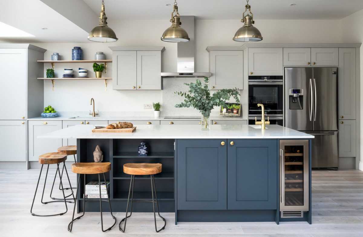 - американская классика – различные комбинации серого, зеленого или чернильного с синим; мебель строгого дизайна, с четкими линиями, двухцветными рамочными фасадами: верх светлый, низ синий.