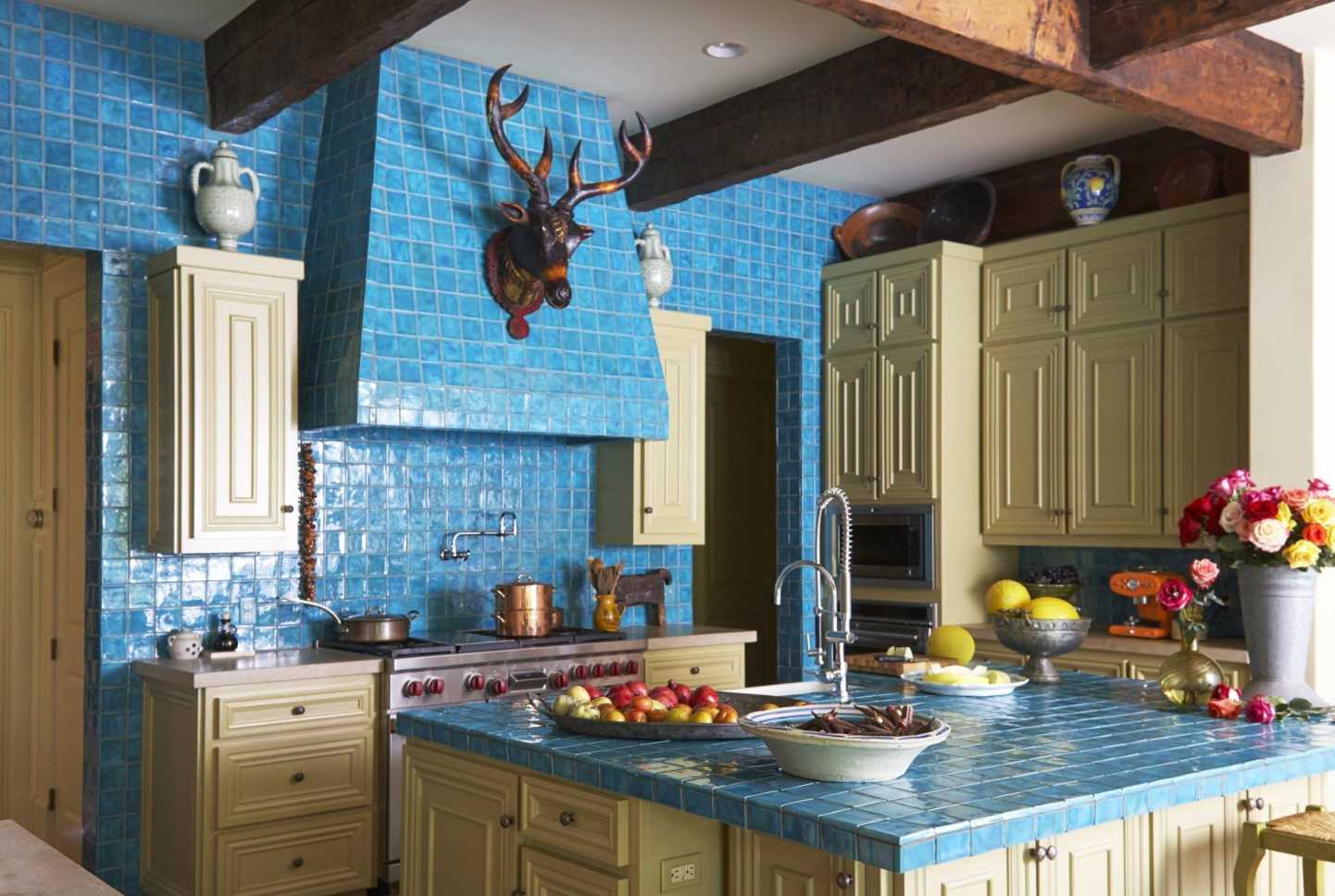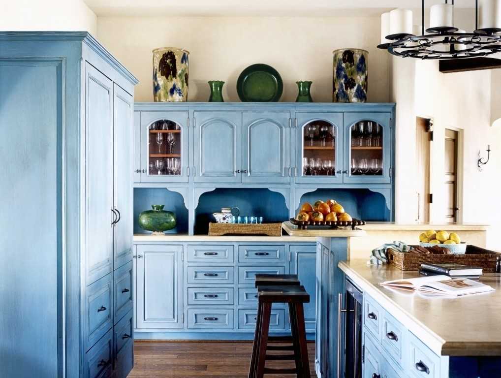 Если вам по душе незабываемый деревенский колорит, то оформите вашу кухню в стиле прованс. Стиль апеллирует именно к природным оттенкам и не приемлет синтетических элементов. Синим можно сделать гарнитур или мебель — для того, чтобы добиться эффекта старины, их обычно красят техникой браширования или кракле (в последнем случае используется специальный лак кракелюр).