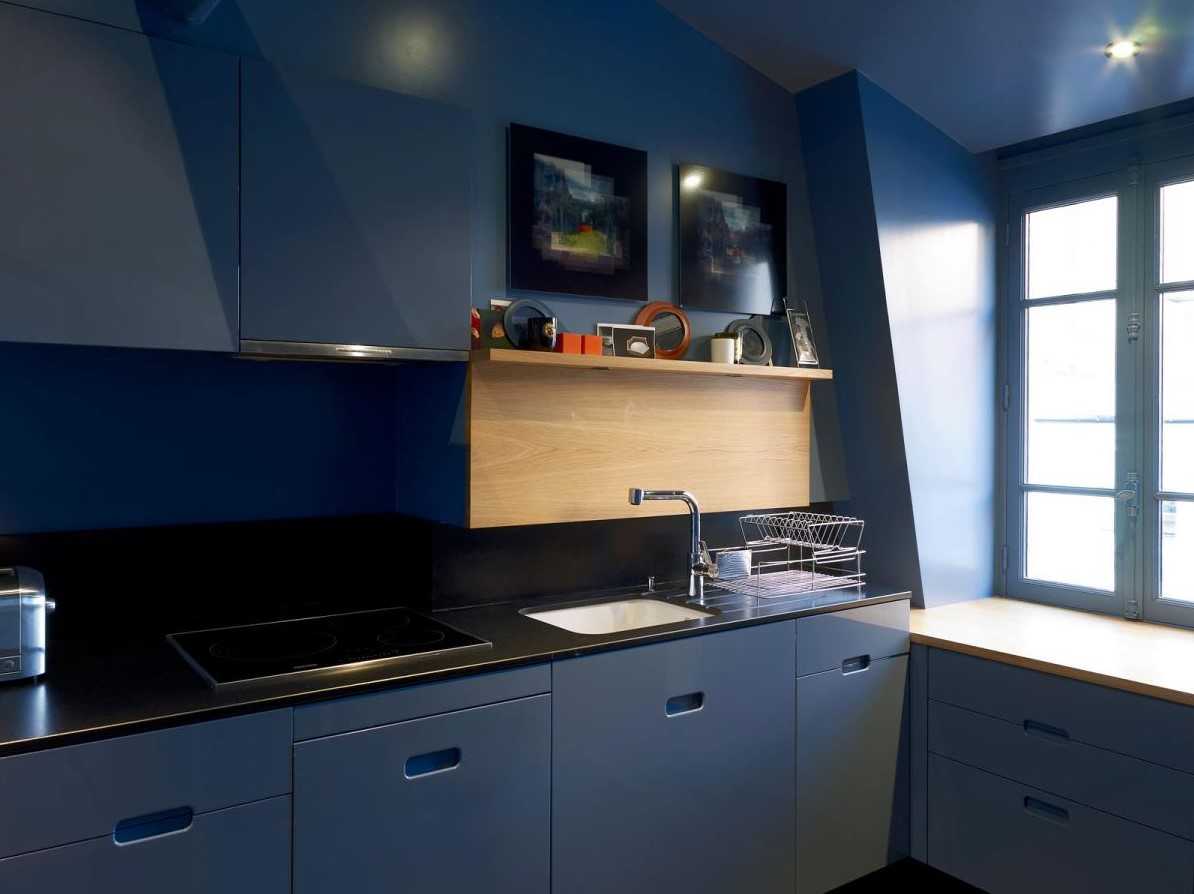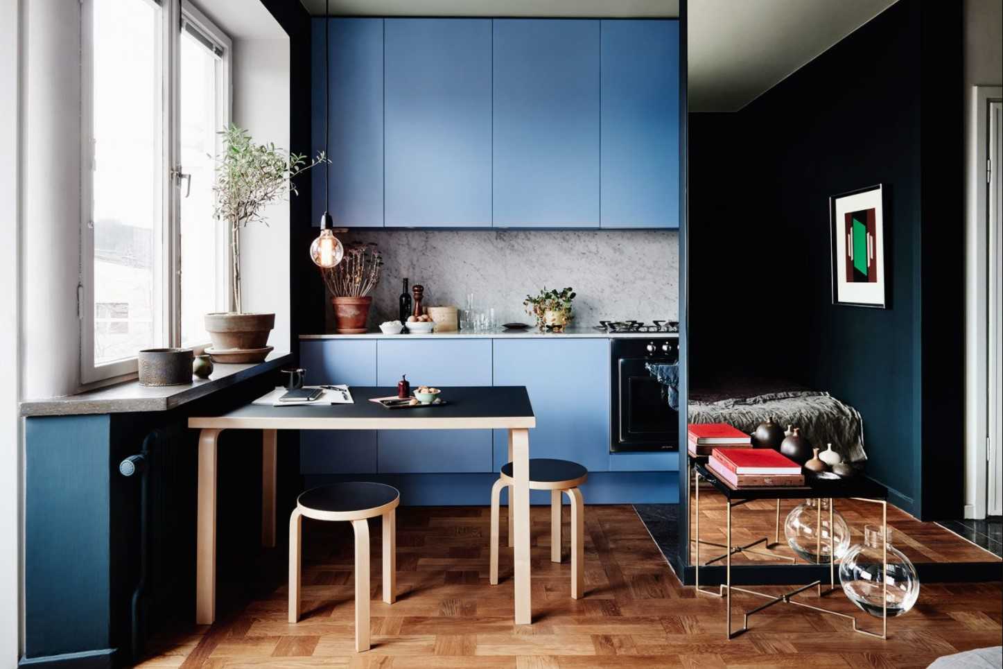 Чтобы помещение не выглядело мрачным, в интерьер была внесена нотка свежести, синий цвет стоит применять только в акцентах. Например, синей могут быть обивка, занавески, скатерть, часть гарнитура, обои одной из стен. Дизайнеры отмечают, что, если покрасить либо обклеить одну из стен синим цветом, зрительно она отдалится. Это сделает кухню просторнее.