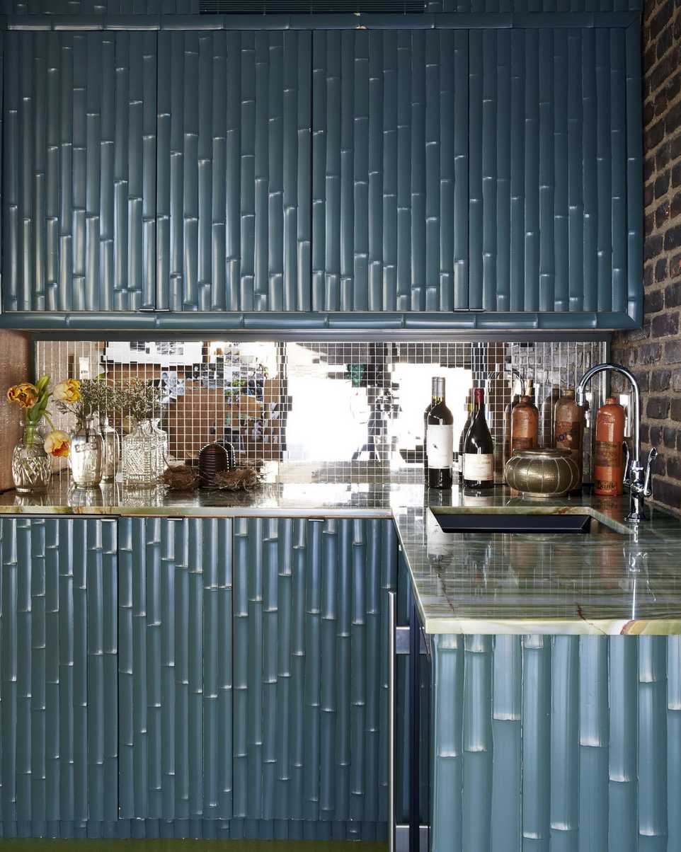 Также эффектно смотрится матовая синяя поверхность в сочетании с металлическими плоскостями. На фото ниже, например, использованный лазурный цвет органично дополняет грубые натуральные текстуры.