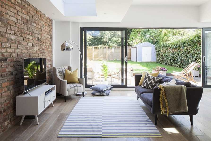 Отделка фрагментов стены камнем, деревом, кирпичом, деревянные стойки, неокрашенные кирпичные стены – это приемы для оформления гостиной в частном доме.