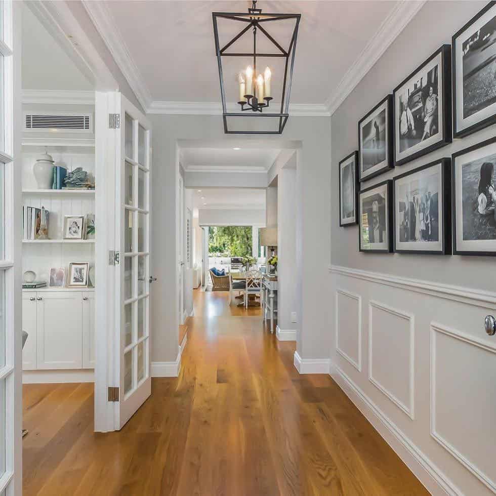 - Интересное цветовое решение – разделение стены на две части по горизонтали с помощью молдинга. Верхняя часть, как правило, светлее нижней. Такой выбор поможет избавиться от тоннельного эффекта длинного коридора. Молдинг обычно белый или же выбирается под цвет