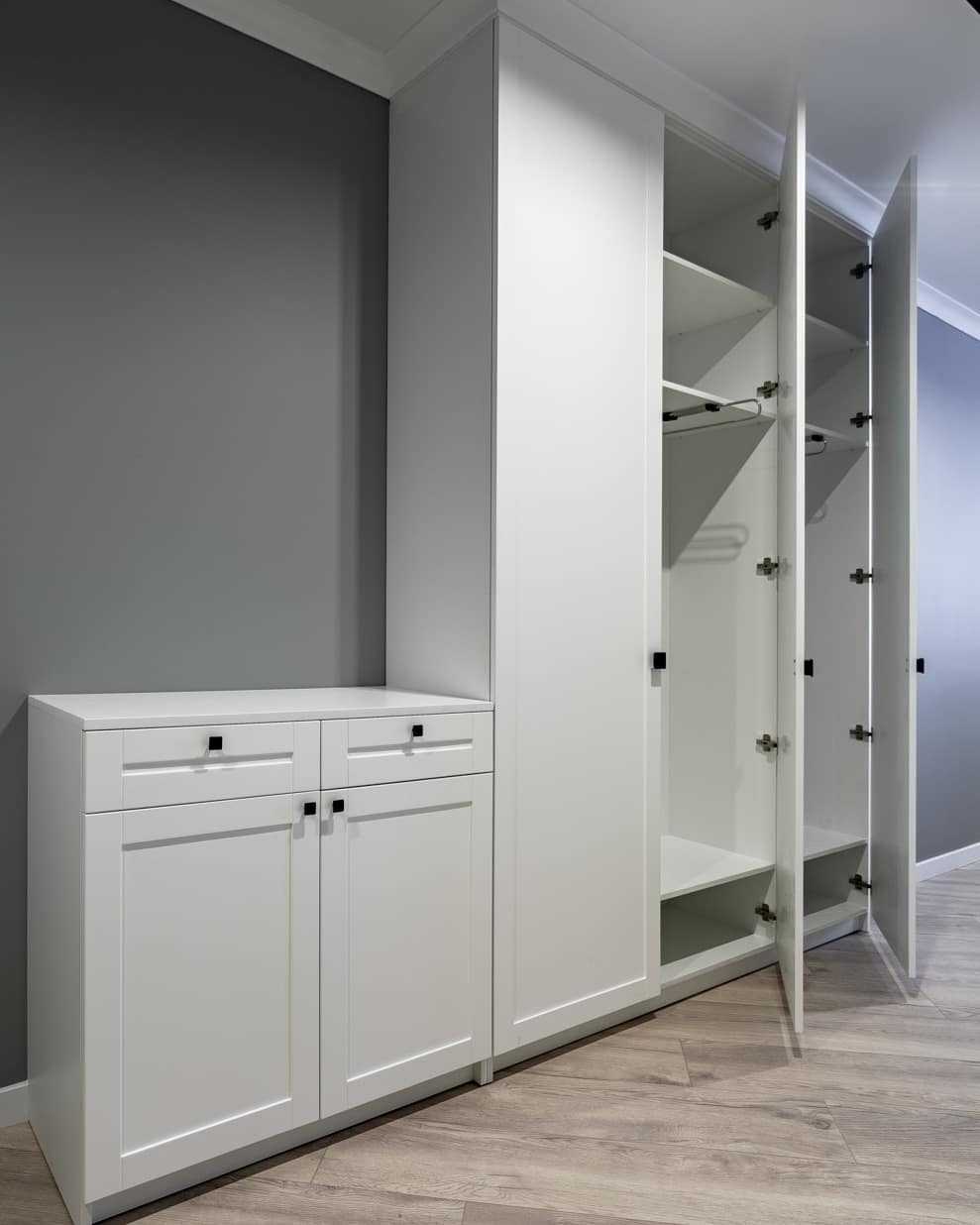 Отказ от открытых вешалок и крючков для зимней верхней одежды. Они не носят никаких декоративных нагрузок, но занимают много места, если постоянно не используются в соответствии с их назначением. Выход — модульная мебель, включающая только встроенные шкафы и полки.