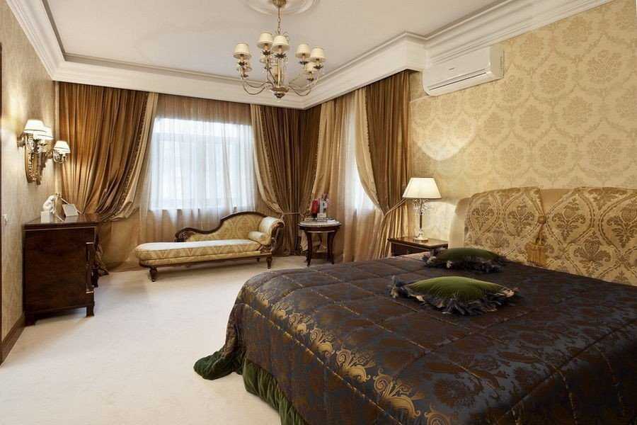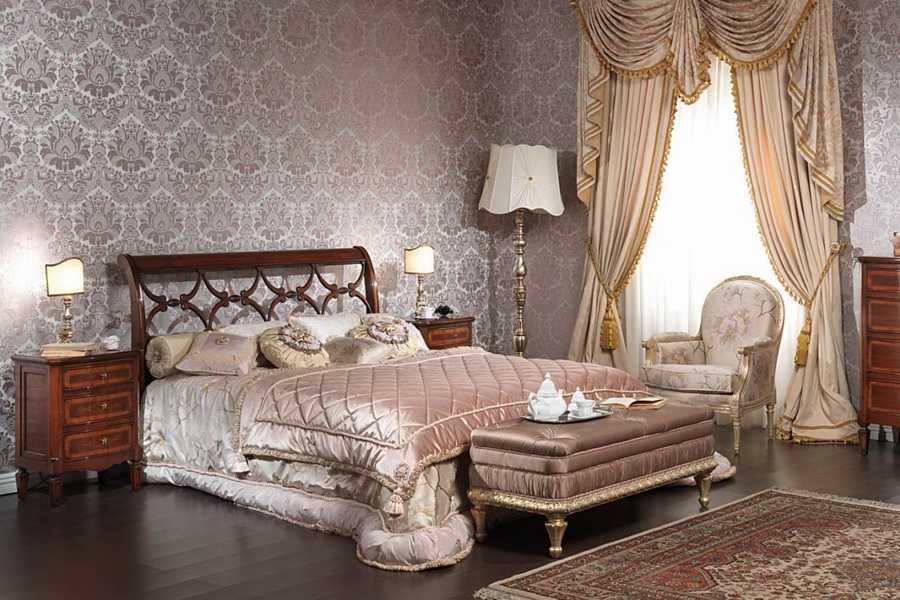 Рекомендованные виды тканей для оформления классической спальни: парча, лён, тафта, шёлк, бархат.
