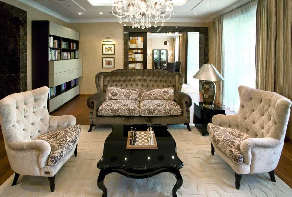 СоветСтильная гостиная отличается присутствием предметов различных форм, которые должны сочетаться между собой, не нарушать общей элегантности интерьера.