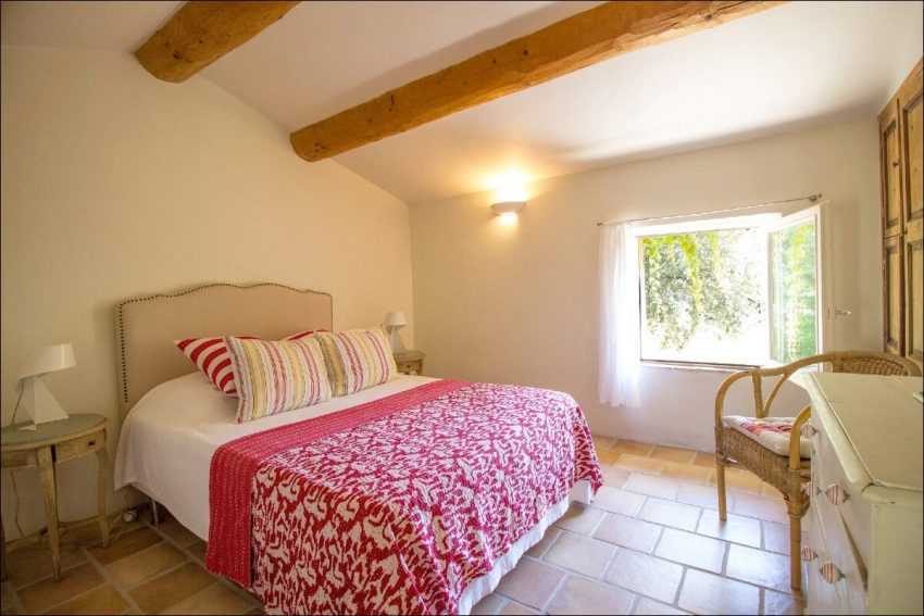 Несмотря на то что основными материалами в оформлении комнаты являются дерево и камень, список отделки для стен, пола и потолка не так скуден. К примеру, стены в спальной комнате можно обшить древесными стеновыми панелями, которые для большего соответствия провансу можно окрасить светлой краской. Не менее достойным вариантом для отделки стен может стать их обработка шероховатой штукатуркой.