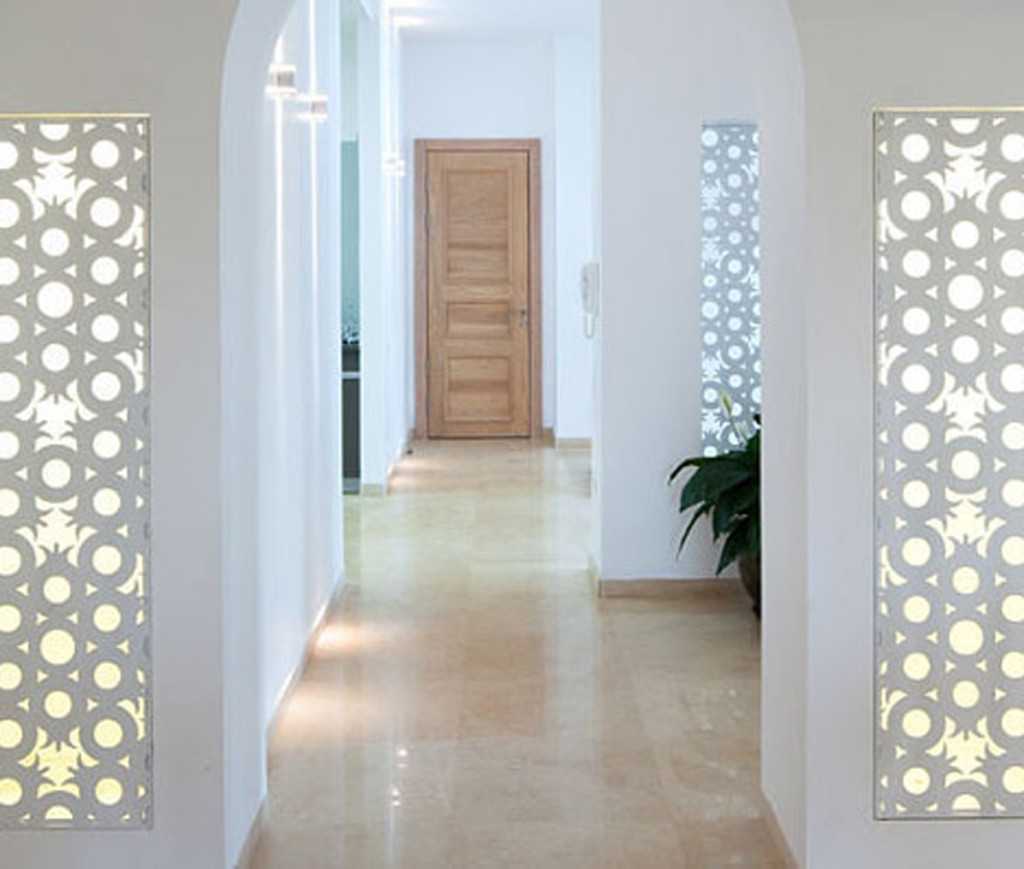 Восточный коридор обычно изобилует сводчатыми арками и светильниками. Идеальное решение – игра на контрасте темных и светлых оттенков. Светлые стены можно дополнить деревянными панелями оттенка венге, добавить росписи с изображением сакуры, бонсай или арабскими орнаментами. Восточный коридор любит приглушенное и немного загадочное освещение.