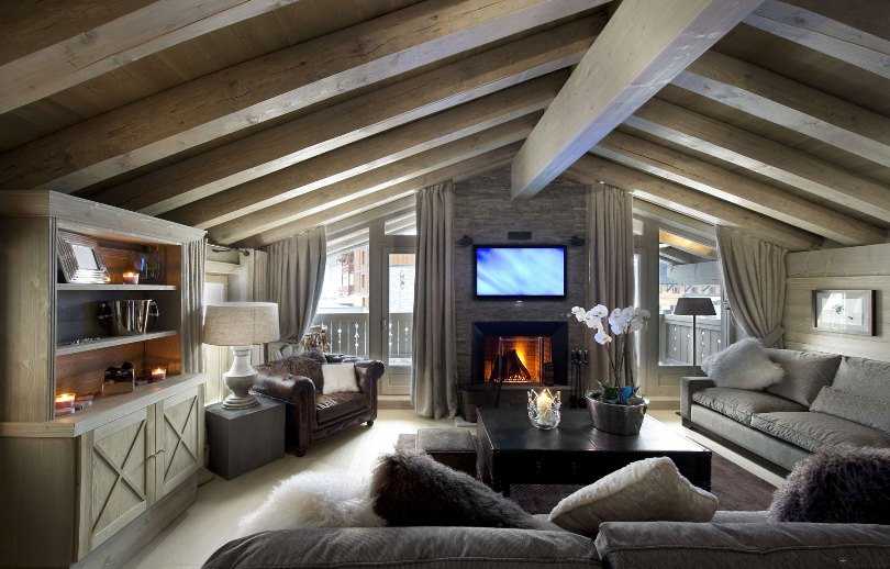 Данное направление характеризуется, как охотничий стиль. Родиной шале является Швейцария, где такое оформление почти в каждом деревенском домике. Гостиная в таком доме обязательно снабжается большими кожаными диванами и креслами, которые не только украшают собой интерьер, но и служат спальным местом при необходимости.