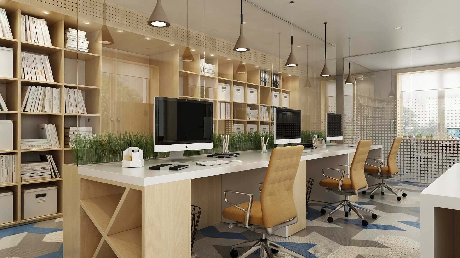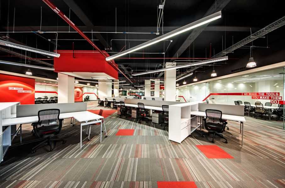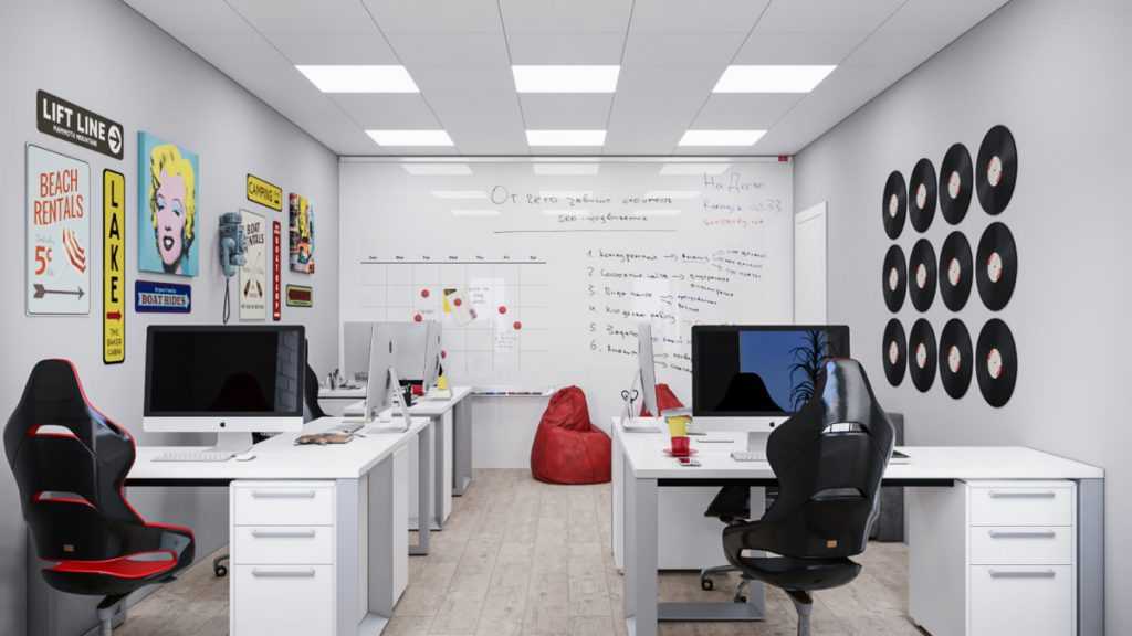 - продумайте не только рабочие места, но и другие важные зоны — лаунж, ресепшн, переговорные, кухню.