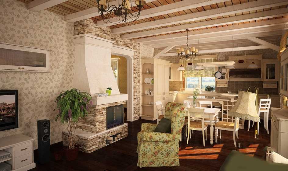 На полу комнаты гармонично смотрится простая домотканая дорожка или небольшой ковер с цветочным узором. Дополняют уютную обстановку помещения небольшой камин и плетеные кресла из натурального ротанга.