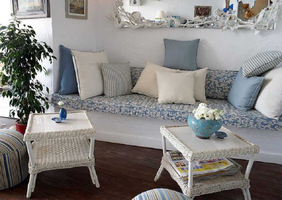 В деревенском интерьере встречаются деревянные, кованые и плетеные диваны. Они обязательно украшаются маленькими подушками с цветочными мотивами, вносящими особую домашнюю атмосферу тепла и уюта.