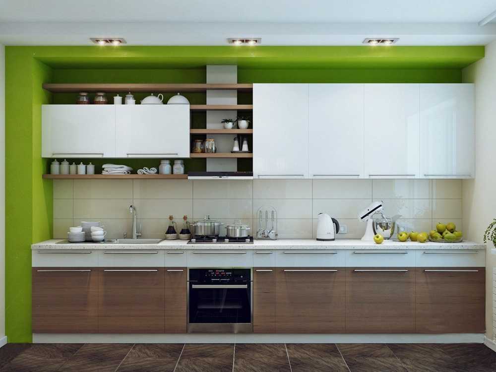 Универсальный белый фон станет отличным решением для яркого и светлого помещения с зеленой мебелью. При этом можно выбирать любые оттенки природы – от глубокого и темного лесного до яркого салатового. Оригинальным решением станет использование травяной краски для стен и светлого покрытия для кухонных фасадов. Белая керамическая плитка с зеленым растительным или геометрическим орнаментом может стать практичным и долговечным фартуком. Потолок такого же тона в зеленую клетку оживит кухню с большим количеством серых поверхностей.