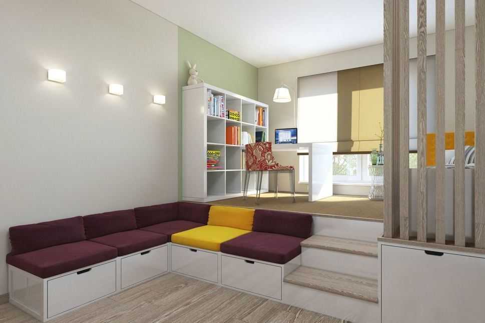 Разный уровень пола или потолка — один из популярных способов зонирования в современных маленьких квартирах. Это решение особенно актуально в помещениях с высокими потолками. На подиум можно вынести и зону столовой, и зону спальни, и детский уголок, и рабочую зону. В нише подиума легко обустроить удобные ящики и ли другие места для хранения.
