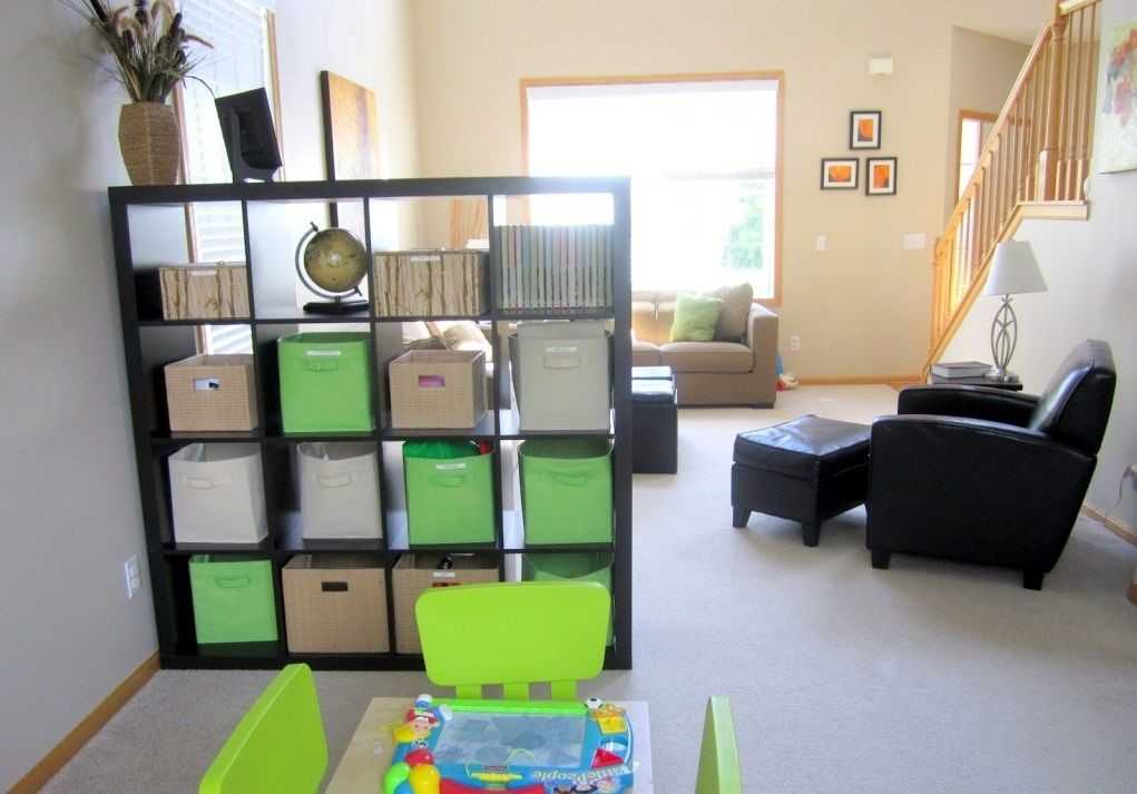 Отличное решение для разделения пространства на зоны – стеллаж. Вместо сквозных полок можно использовать шкафы с задней стенкой, которую можно использовать в качестве доски для надписей.