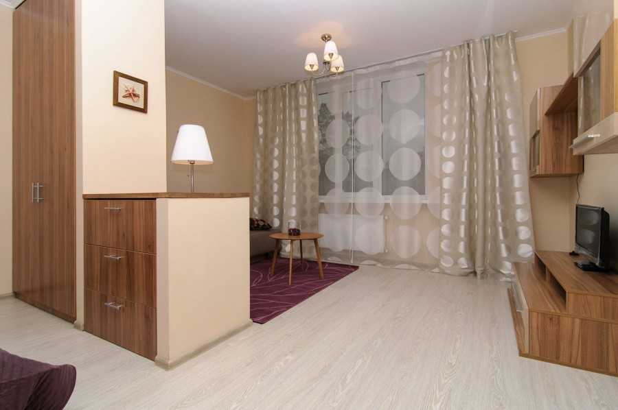 Большие окна создают атмосферу уюта и мягкости. Квартира так же оборудована искусственным освещением – светильники и бра вечером создадут непрямой мягкий свет. Квартира подходит как для девушки, так и для молодой пары.