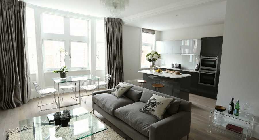 Для такой квартиры не принципиально четкое деление на зоны, так как они могут совмещаться и пересекаться. Обеденную зону легко можно совместить с гостиной или спальней.