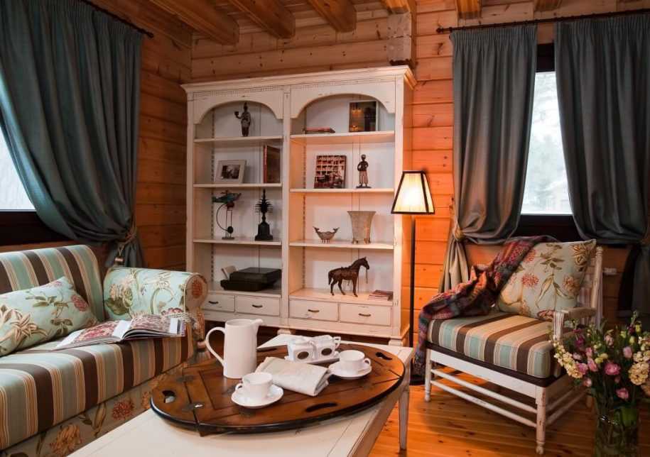 Стиль не требует ни большого количества дорогостоящей мебели, ни захламления декором. Естественные материалы оживят атмосферу помещения, а украсить обстановку можно даже красивой корягой. При этом потратиться придется только на антибактериальную пропитку и на лак.