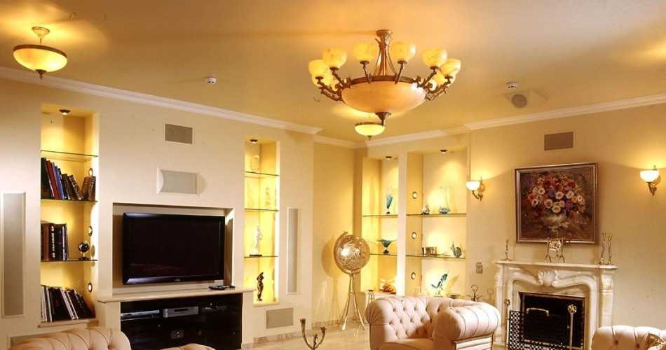 - Освещение. Границу между зонами могут обозначить торшеры, подвесные светильники, настенные бра, красивые потолочные люстры. Удачным вариантом станет комбинированное освещение. Часто по периметру зон выстраивают потолочные споты.